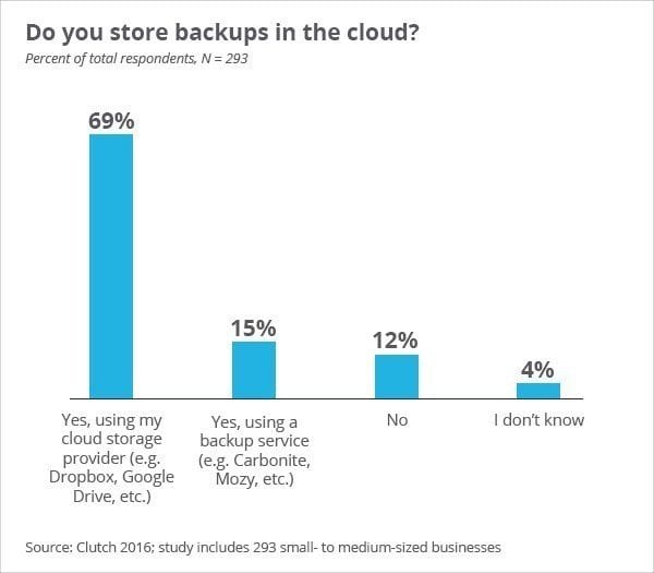 Nearly 70 percent of small businesses instead use a provider such as Google Drive or Dropbox to backup files and data in the cloud. This may be due to overconfidence and the rare need for backups, says Mark Estes, Regional Director of Sales at Qubole. However, data loss does occur and if the user wasn’t utilizing an automated service and forgot to manually back it up, then there are no further options.