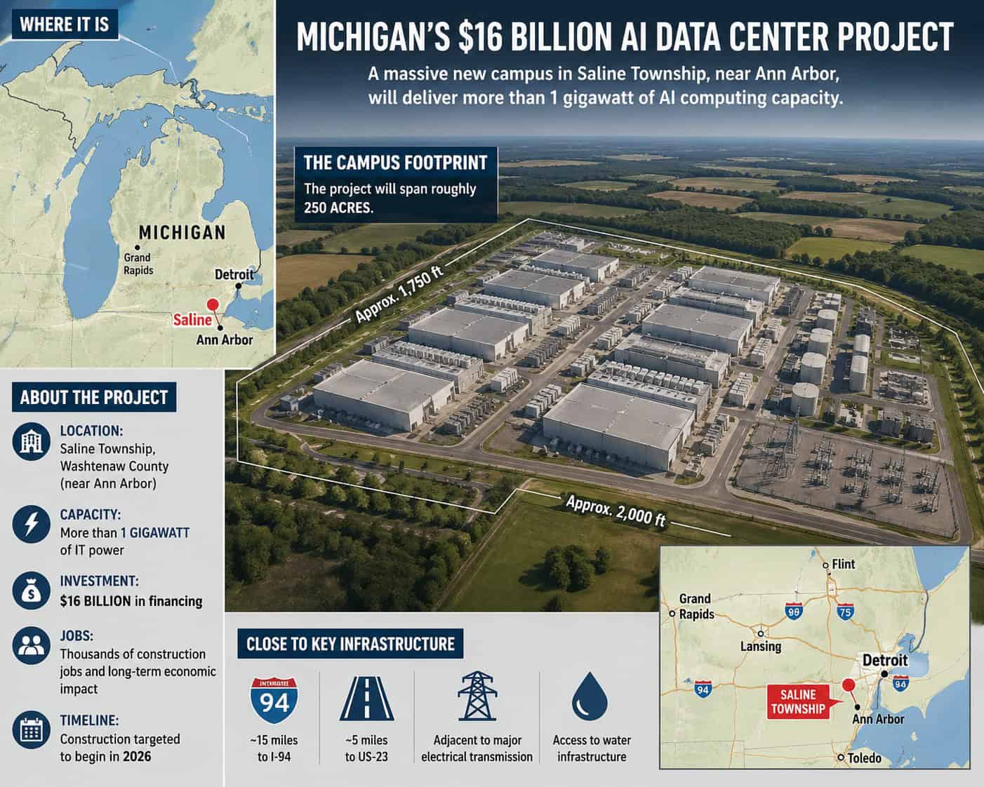 Backed by Oracle Corporation and tied to OpenAI, the proposed data center campus in Saline Township has secured a staggering $16 billion in financing, transforming a stretch of farmland into ground zero for the next phase of the AI economy.